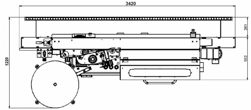 ПОДАЮЧИЙ КОНВЕЄР Деталь подається ланцюговим конвеєром з гумованими башмаками. Ширина черевиків 73 мм. Привід-мотор-редуктор 2,2 кВт VARVEL.