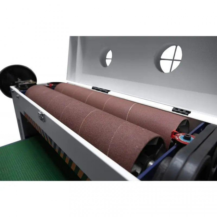 Потужний двигун на 2200 Вт + 120 Вт гарантує ефективне шліфування, а регульована швидкість шліфувальної стрічки дає змогу оптимізувати процес під різні види матеріалів. Велика ширина робочої поверхні (635 мм) дозволяє швидко обробляти великі площі, що значно підвищує продуктивність роботи.