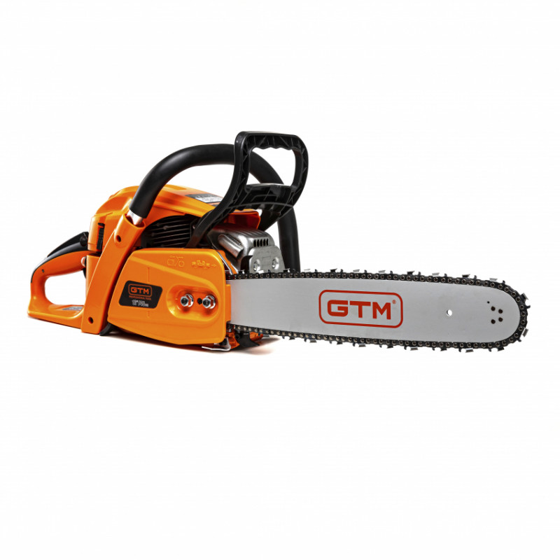 GTM CN45D-CH - високопродуктивна бензопила напівпрофесійного класу, призначена для середніх навантажень під час обрізання саду, заготівлі дров, столярних і теслярських роботах в будинку. Інструмент обладнаний 2-тактним бензиновим двигуном з потужністю 1,9 кВт (2,6 к.с.) з підвищеним крутним моментом і збільшеним ресурсом роботи. Як паливо використовується суміш бензину з моторним мастилом у пропорції 40:1 (на 1 л бензину 25 мл мастила).