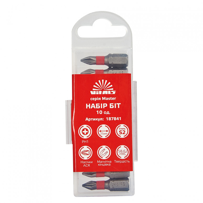 Біти S2 PH1×25 мм, 10 шт. Vitals Master призначені для ефективного відкручування та закручування кріпильних елементів з типом шліцу PH1(з хар-к). Довжина насадок складає 25(з хар-к) мм. Використовується як в ручному інструменті, так і з шурупокрутами, завдяки універсальному шестигранному хвостовику 1/4″.