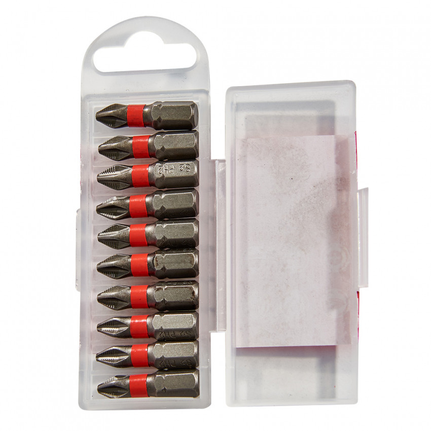 Біти S2 PH2×25 мм, 10 од. Vitals Master призначені для ефективного відкручування та закручування кріпильних елементів з типом шліцу PH2. Довжина насадок складає 25 мм. Використовується як в ручному інструменті, так і з шурупокрутами, завдяки універсальному шестигранному хвостовику 1/4″.