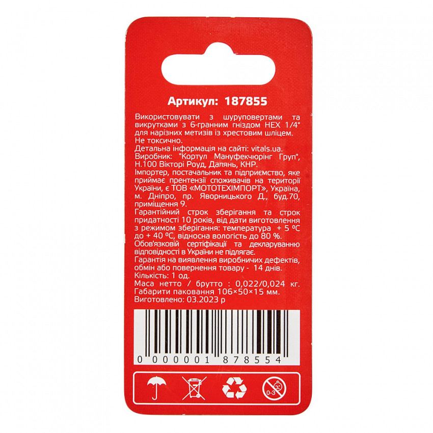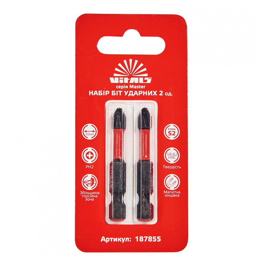 Біти ударні S2 PH2×50 мм, 2 од. Vitals Master призначені для відкручування та закручування кріпильних елементів з типом шліцу PH2 за допомогою ударних шурупокрутів та гвинтокрутів. Довжина насадок складає 50 мм.
