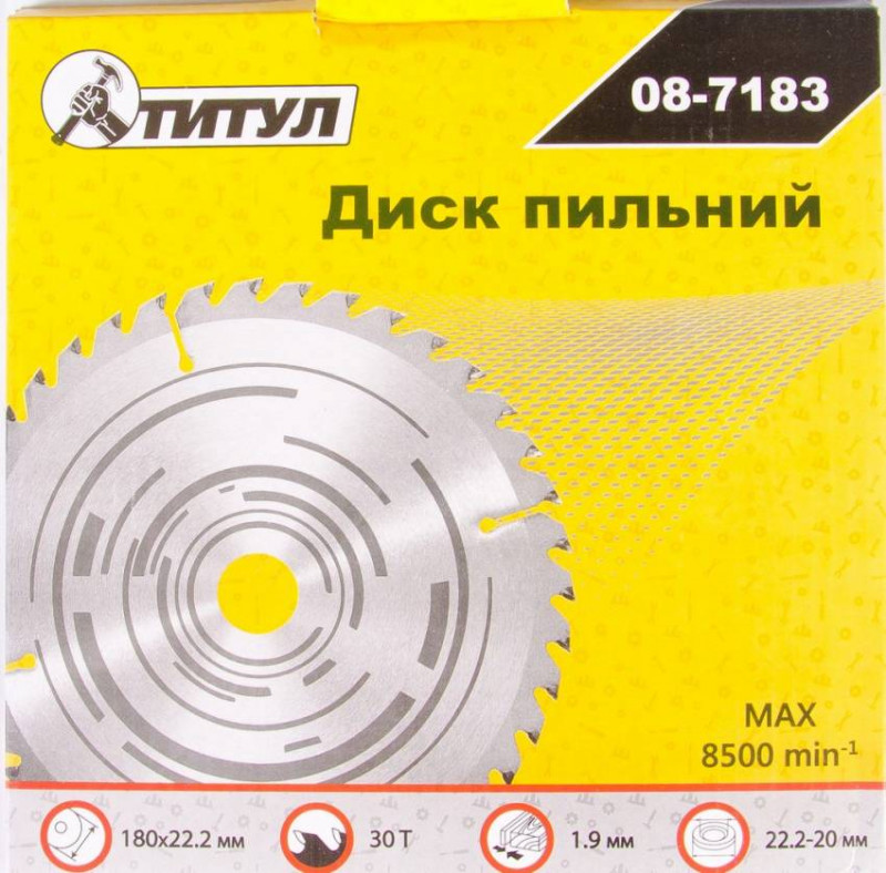 Характеристики Диск пильний для дерева ТИТУЛ із твердосплавними напайками 180х22.2х30Т адаптер 22.2-20 08-7183
