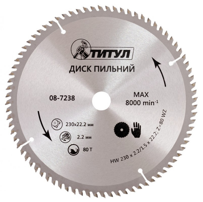 Про товар Диск пильний для дерева ТИТУЛ з твердосплавними напайками 230х22.2х80Т 08-7238