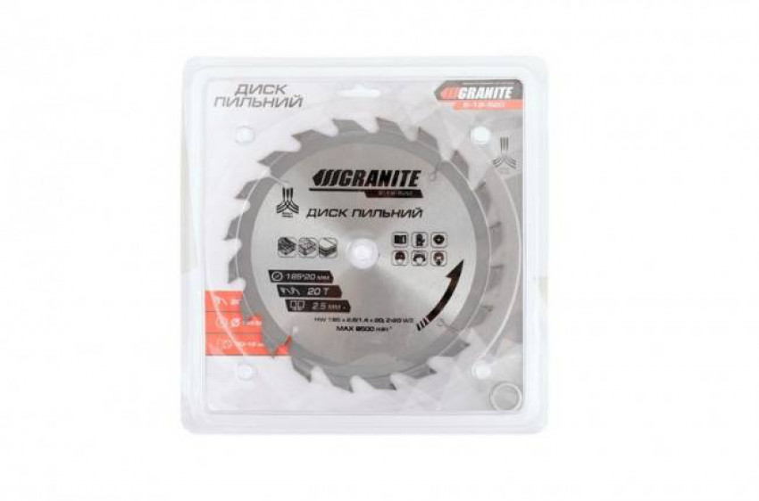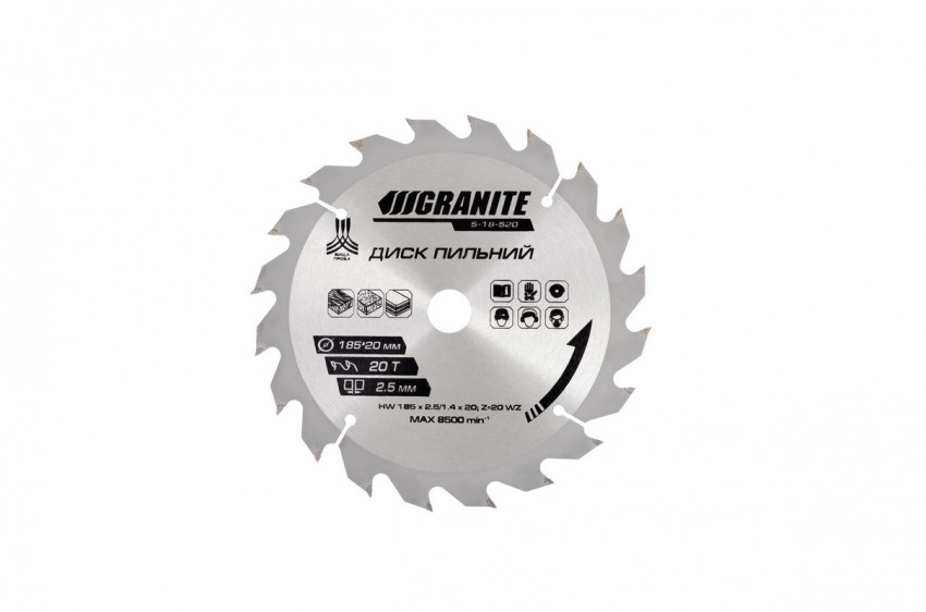 Диск пильний для дерева з твердосплавними напайками 185*20*20Т, адаптер 20-16, 8500 об/хв, GRANITE