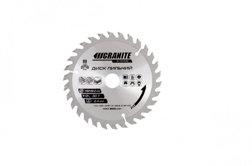 Характеристики Диск пильний GRANITE для дерева з твердосплавними напайками 150х22.2х30Т адаптер 22.2-20 9500 об/хв 5-15-030