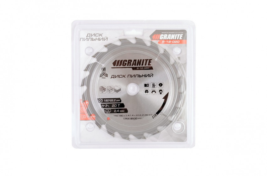Про товар Диск пильний GRANITE для дерева з твердосплавними напайками 180х22.2х20Т адаптер 22.2-20 8400 об/хв 5-18-020