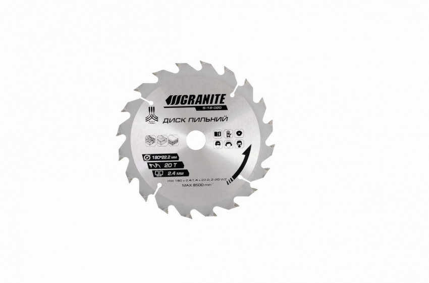 Характеристики Диск пильний GRANITE для дерева з твердосплавними напайками 180х22.2х20Т адаптер 22.2-20 8400 об/хв 5-18-020