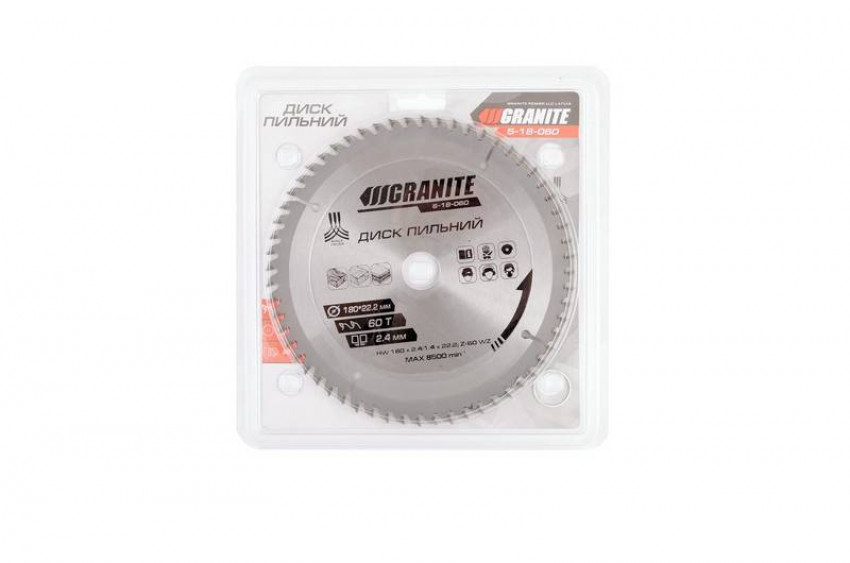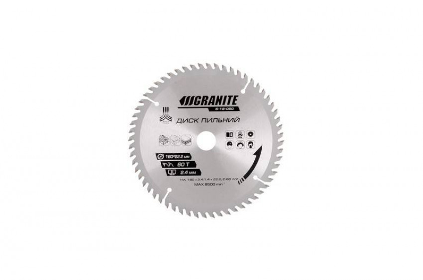 Характеристики Диск пильний GRANITE для дерева з твердосплавними напайками 180х22.2х60Т адаптер 22.2-20 8400 об/хв 5-18-060