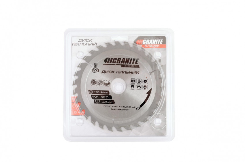 Характеристики Диск пильний GRANITE для дерева з твердосплавними напайками 180х32х30Т адаптер 32-30 8500 об/хв 5-18-031