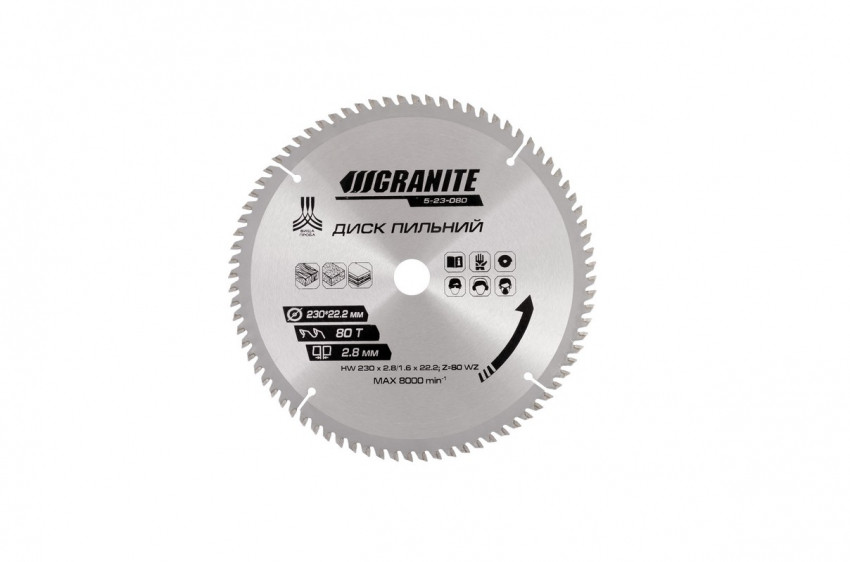 Характеристики Диск пильний GRANITE для дерева з твердосплавними напайками 230х22.2х80Т 8000 об/хв 5-23-080