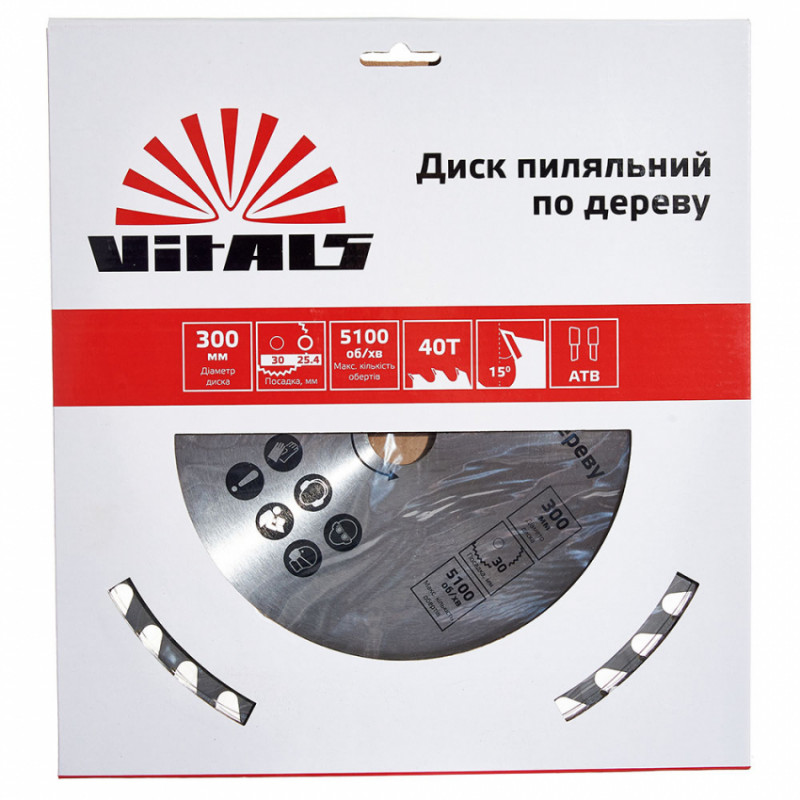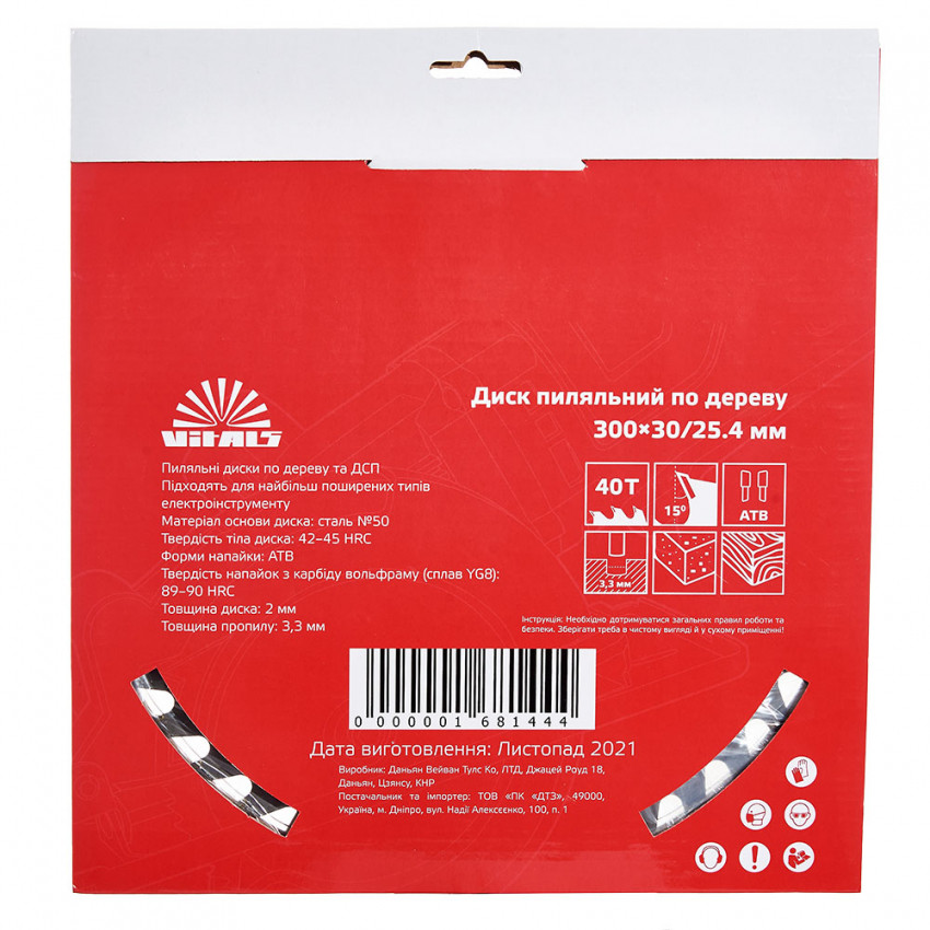 Пиляльний диск Vitals по дереву 300x30/25.4, ATB 40 підходить для поздовжнього та поперечного розпилу деревини - як м'якої, так і твердої породи, а також ДВП, ДСП.