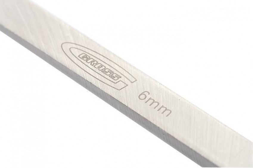 Долото-стамеска торгової марки GROSS призначена для проведення столярних та теслярських робіт, таких як довбання пазів та гнізд, зняття фасок та шліців тощо. Полотно стамески виготовлене з високоякісної інструментальної сталі, володіючи високим параметром твердості (68 HRC). Робоча кромка полотна шириною 6 мм заточена під кутом 28 градусів та загартована на довжину 7 мм. Лита двокомпонентна рукоятка забезпечує надійне та зручне захоплення. Металевий потилич рукоятки дозволяє за необхідності використовувати ударний інструмент. Загальна довжина стамески становить 285 мм, маса інструменту не перевищує 210 м-коду.