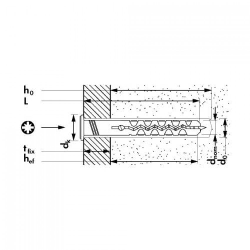 Діаметр анкера та бура d(nom)=d(0) 6 мм.; Довжина L 40 мм; Діаметр бортика d(k) 9 мм; Корисна довжина t(fix) 10 мм; Глибина отвору h(0) 35 мм; мін. глибина установки h(ef) 30 мм; Насадка PZ2; Отвір у пластині, що закріплюється, d(f) 6 мм.