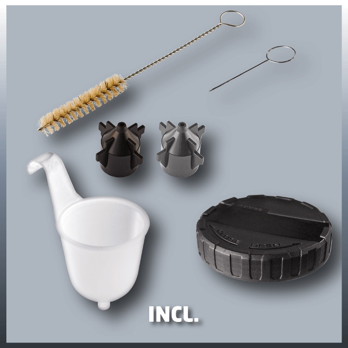 У комплект поставки входять: два сопла для різної вязкості лаку, фарби і глазурі, резервуар для проби вязкості, щітка і голка для чищення, а також бачок для фарби обємом 1000 мл з кришкою. Інструкція з експлуатації