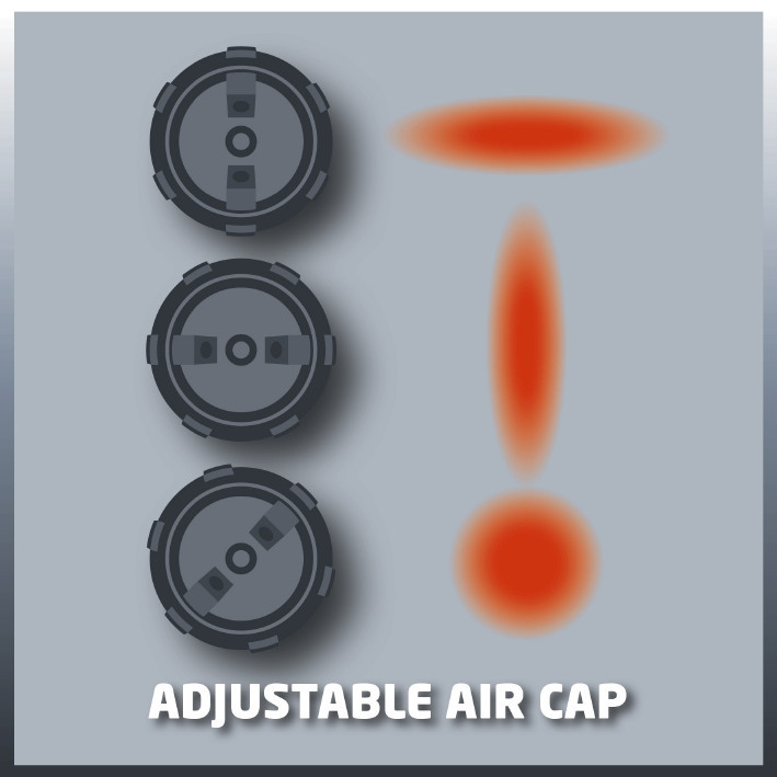 Регулювання інтенсивності подачі фарби Регулювання сопла для вертикального, горизонтального чи круглого струменя Повітряний шланг, що не перекручюється Комфортна робота завдяки м'яким накладкам Softgrip Два сопла для різної вязкості лаку і глазурі Щітка для прочищення сопла Голка для прочищення сопла Резервуар для визначення вязкості