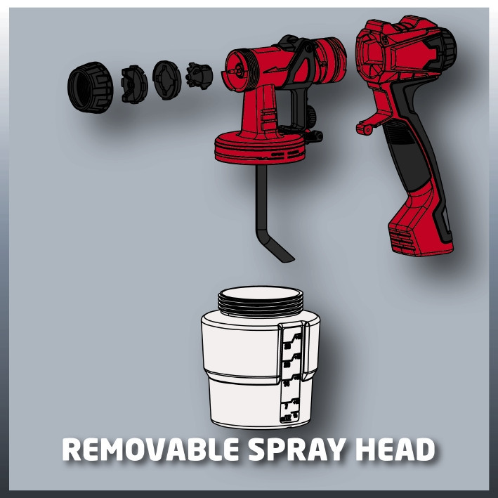 Регульоване сопло для вертикального, горизонтального та круглого струменів дозволяє адаптувати фарборозпилювач до різних завдань. Змінна розпилювальна головка дає можливість легко очищати всі елементи, котрі вступають в контакт з фарбою.
