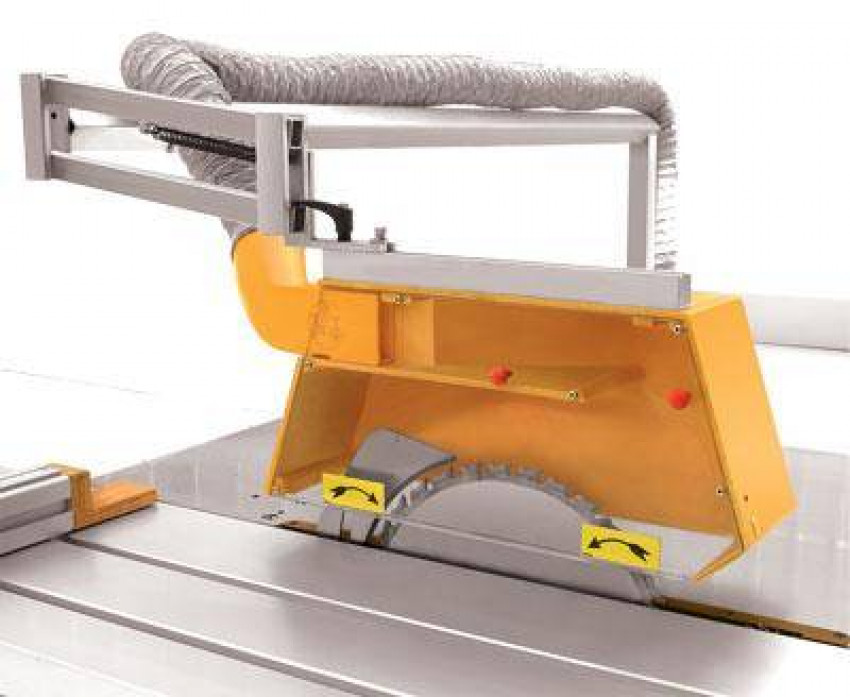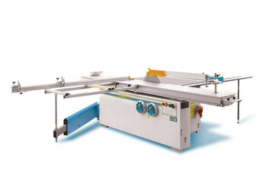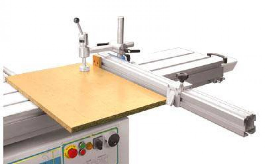 Форматний алюмінієвий стіл із загартованими сальні напрямні. Телескопічна лінійка 1500 мм з двох повертають упору. Лінійка для паралельна різка з микрометрическая налаштування. Розширення столу для широта зрізу 1250 мм. Способу диска до 45° зі зчитування по шкалу.