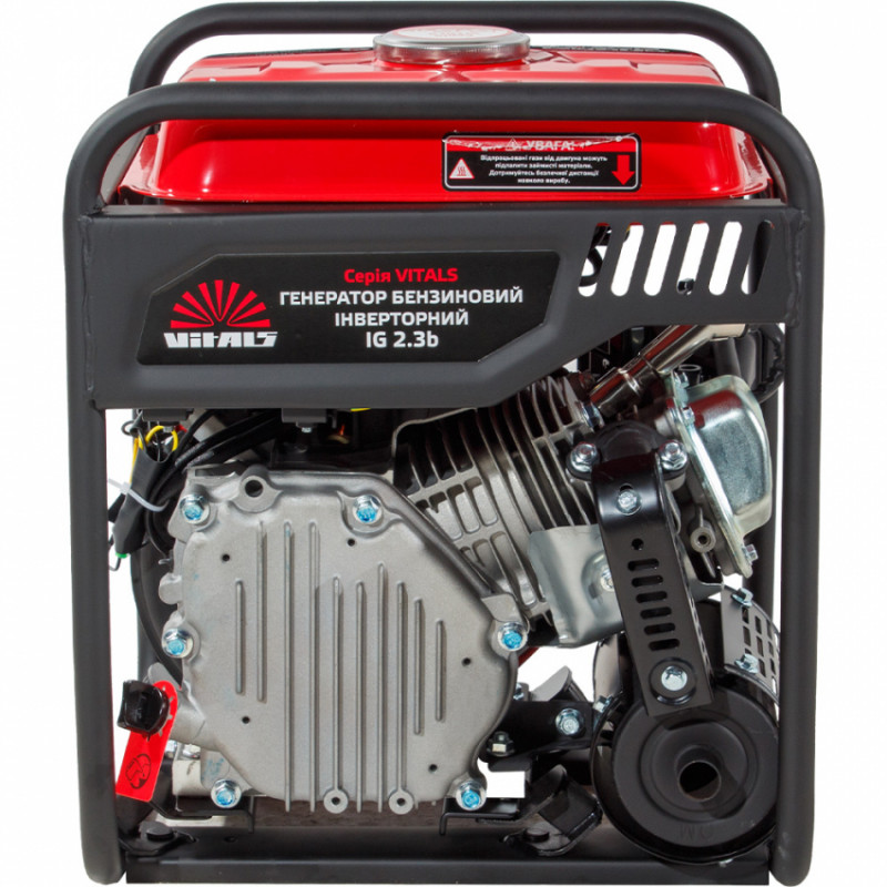 У генераторі Vitals IG 2.3b використовується чотиритактний бензиновий двигун з верхнім розташуванням клапанів. Інноваційна конструкція кришки стартера та крильчатки охолодження запобігає перегріву двигуна. Промисловий глушник забезпечує посилене поглинання шуму, покращене відведення та розподіл тепла. Шум і вібрації додатково знижуються завдяки демпферним опорам, якими двигун кріпиться до жорсткої металевої рами.
