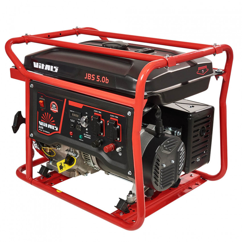 Бензиновий генератор Vitals JBS 5.0b – компактна переносна силова установка, призначена для аварійного або резервного електроживлення побутових споживачів однофазного змінного струму напругою 230 В частотою 50 Гц. здатним виробляти змінний електричний струм максимальної потужності 55 кВт. Важливо, що обмотки ротора і статора генератора - 100% мідь! Запуск двигуна здійснюється ручним стартером. Паливний бак, встановлений на агрегаті, має ємність 25 л, завдяки чому міні-електростанція здатна безперервно протягом 10-15 годин забезпечувати стійкою електроенергією будинок, дачу, гараж або складське приміщення. На даному силовому агрегаті встановлено сучасний автоматичний регулятор напруги (AVR), що забезпечує стабільною вихідною напругою у всьому діапазоні навантажень. Якість енергії електростанції дозволяє сміливо використовувати її для забезпечення електроживленням побутових та спеціальних споживачів, складного електронного обладнання, а також засобів зв'язку (телевізорів, комп'ютерів, холодильників, опалювальних котлів, насосів, електродвигунів тощо). Для захисту від перевантаження електричного ланцюга передбачені автоматичні запобіжники змінного і постійного струмів. JBS 5.0b обладнана виведенням постійного струму напругою 12 В, який призначається, в основному, для зарядки автомобільних акумуляторних батарей. його з ладу.Генератор Vitals JBS 5.0b виготовлений з дотриманням усіх сучасних вимог електробезпеки, що забезпечує надійний захист від ураження електричним струмом.Гарантія на генератор складає 36 місяців або 800 мотогодин!