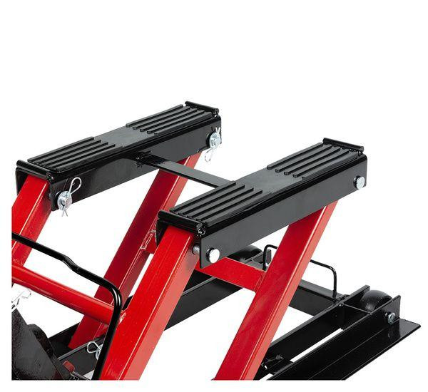 Міцна сталева конструкція має високу стійкість до деформацій і пошкоджень, а широка основа гарантує стійкість до перекидання. Для захисту транспортних засобів підйомні опори оснащені гумовими накладками. Для безпечності роботи є запобіжні засувки. Опційно можна замовити ремені для фіксації транспортного засобу при підйомі. 4 колеса (2 з яких поворотні) і ручка роблять цей підйомник для мотоциклів надзвичайно мобільним.