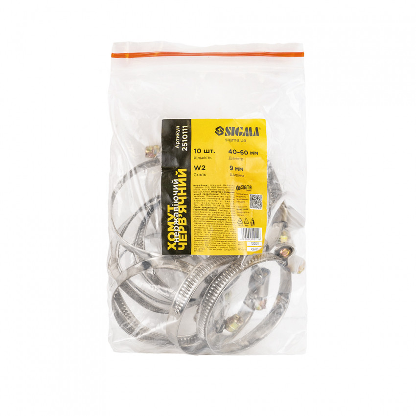 Характеристики Хомут черв'ячний нержавіючий 9мм D40-60мм 10шт Sigma (2510111)