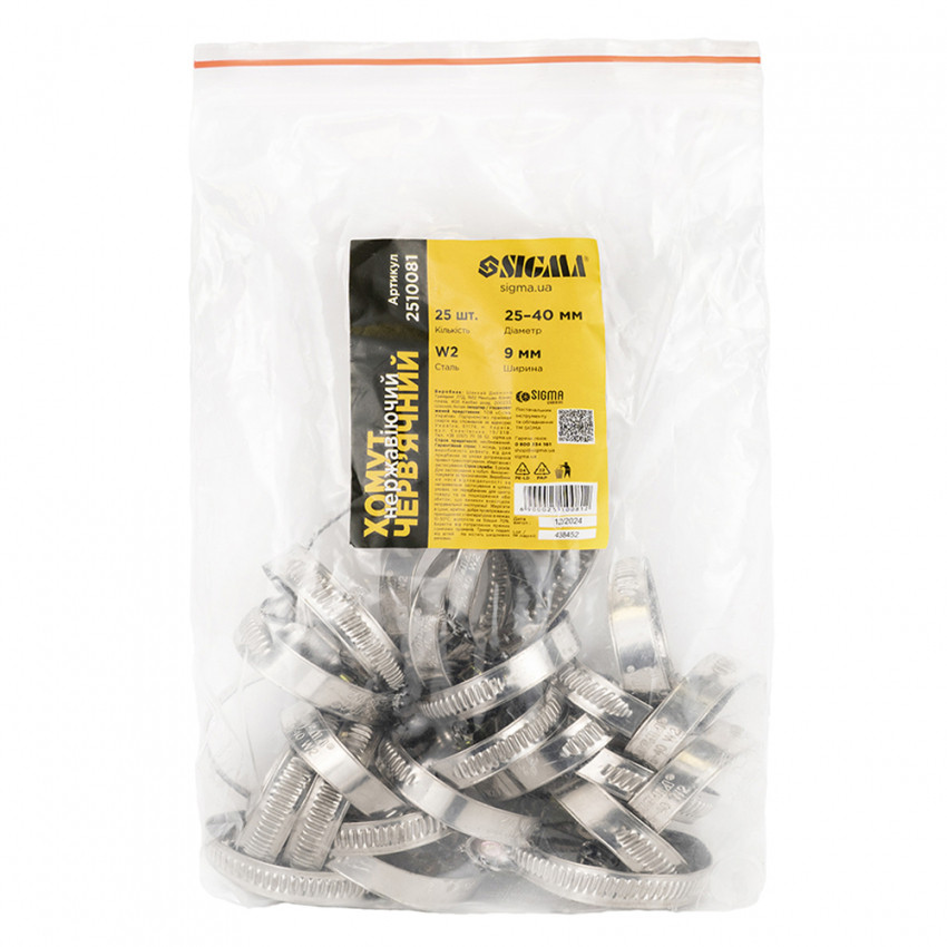 Характеристики Хомут черв'ячний нержавіючий 9мм D25-40мм 25шт Sigma (2510081)