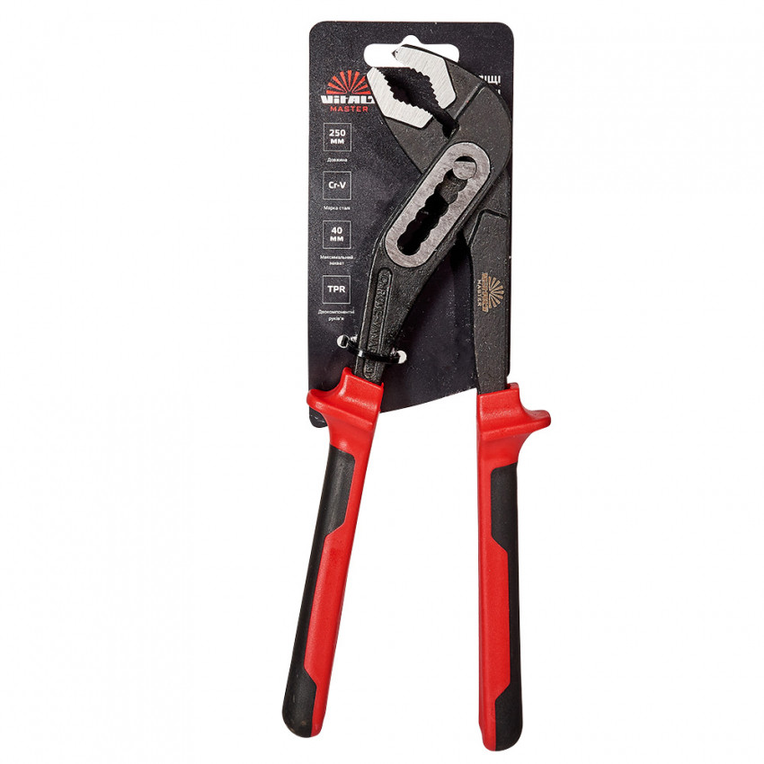Кліщі переставні 250 мм захват 40 мм Vitals Master використовуються як трубний або розвідний ключ, для фіксації та відвертання/загортання з деталями круглого та шестигранного профілю.