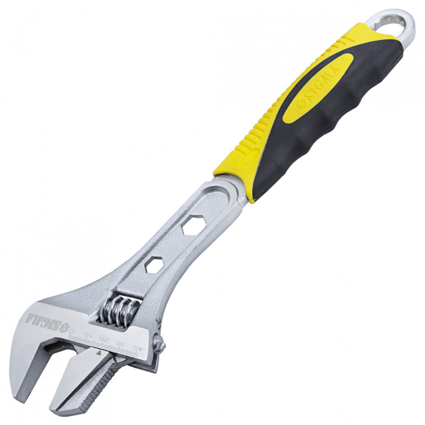 <b>Ключ розвідний з переставною губкою 300мм, 0-41мм CrV (TPR) Sigma (4100941)</b> призначений для відгвинчування і загвинчування гайок, болтів, гвинтів та інших різьбових з'єднань. Зручний при сантехнічних роботах, ремонті автомобілів і велосипедів. Виготовлений із високоякісної хромованадієвої сталі з антикорозійним покриттям. Має рухому переставну губку, зазубрену з одного боку, завдяки чому може використовуватися як трубний ключ. На губках ключів нанесено міліметрову шкалу для регулювання ширини захоплення. Двокомпонентна ергономічна ручка зручно лежить у руці. Ребриста поверхня ручки не дозволяє ключу вислизнути з руки під час роботи. Ключ оснащений отвором для підвішування.