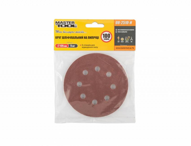 Про товар Коло шліфувальне на липучці MASTERTOOL з 8 отворами 125 мм зерно 100 5 шт 08-2510-H