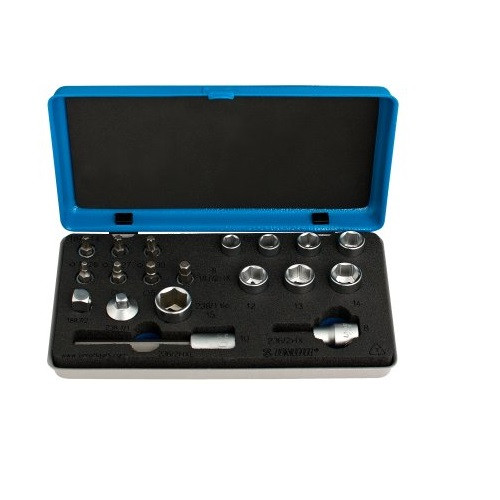- Для забезпечення використання спільно з рукоятками реверсивними або ключами динамометричними кожного розміру, в набір також входять два адаптера - для використання 1/4-дюймових на 3/8-дюймових і застосування інших варіантів.
