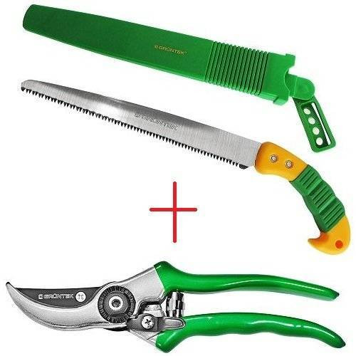 Комплект із садової ручної пилки Gruntek BARRAKUDA та секатора Specht для комплексного догляду за деревами, кущами та квітами. Gruntek BARRAKUDA – ручна обрізна пилка для обрізання гілок гострим лезом із зубами з кроком 8 зуб/дюйм. Потрійне загострення зубів забезпечує швидкий і чистий зріз гілок. Двокомпонентна рукоятка не ковзає у руці під час роботи. Gruntek Specht – секатор для обрізання молодих сирих гілок для догляду за чагарниками та виноградниками. Леза виготовлені із загартованої сталі, завдяки чому інструмент міцний, стійкий до зовнішнього середовища. Гострі леза швидко відрізають гілки, запобігаючи налипання та зажовування гілок. Зручні виїмки під пальці на рукоятці дозволяють надійно захопити інструмент для комфортної роботи. Рекомендується для обрізання гілок діаметром до 20 мм. Комплект Gruntek забезпечить