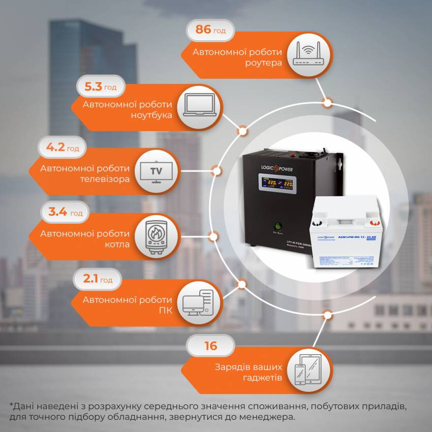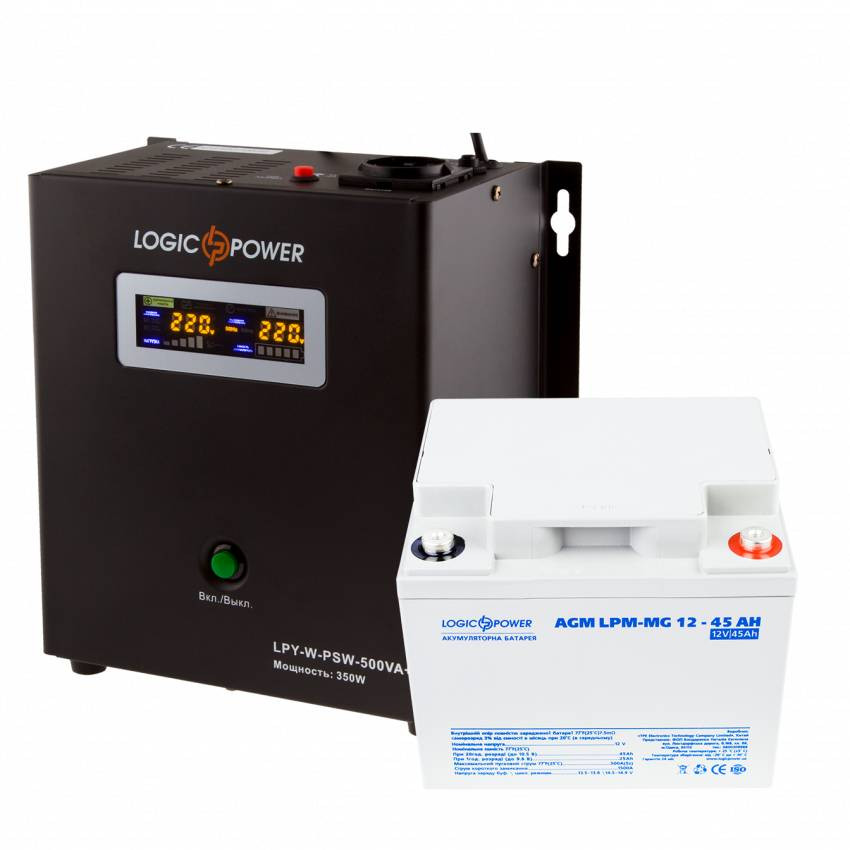 Комплект ДБЖ Logicpower LPY-W-PSW-500VA + (350Вт) 5A / 10A з правильною синусоїдою 12В + Акумулятор гелевий AGM LPM-MG 12V - 55 Ah спеціально підібраний для забезпечення безперебійного живлення електричних газових котлів, систем відеоспостереження, комп"ютерної техніки та разом із цим приладом, які працюють в режимі 24/7/365. ДБЖ (потужність 500/350 VA / W) з правильною синусоїдою виконує функції стабілізатора напруги (на вході - 140-275 V, на виході - 220±10%). ДБЖ і акумуляторна батарея надійно захищені від коротких замикань і перевантажень. ДБЖ LPY-W-PSW-500VA + (350Вт) 5A / 10A має габаритні розміри 229х138х230 мм. Тип підключення до мережі - євровилках, тип підключення навантаження - євророзетка (1 штуки). На зовнішній стороні корпусу LCD екран показує хід роботи. Максимальний струм заряду - 9 А. Акумуляторна батарея AGM LPM-MG 12V - 45 Ah номінальною напругою 12 V має два режими зарядки: буферний (напруга [Зарядное напряжение буферный режим, V] В) і циклічний ([Зарядное напряжение циклический режим, V] В). Максимальний струм заряду - 9 А. Передбачено захист від надлишкового заряду і швидкого розряду. Габаритні розміри - 229х138х230 мм.