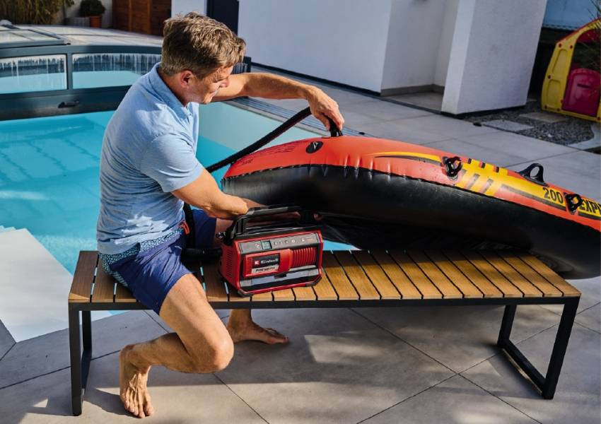 Компресор Einhell PRESSITO 18/25 є частиною сімейства Power X-Change і живиться від акумулятора 18 вольт. Завдяки насосу високого та низького тиску, а також опції всмоктування низького тиску та ручці для перенесення, компресор дуже зручний і функціональний у дорозі та вдома. Кнопковий перемикач дозволяє надувати (високий тиск) без попереднього налаштування тиску. Фактичний і цільовий тиск можна зчитати в барах, psi або кПа на LED дисплеї. При досягненні потрібного тиску насос автоматично вимикається. Набір із 3 адаптерів для шин, м’ячів тощо, а також шланги зберігаються у вбудованих відсіках. Поставляється без акумулятора і зарядного пристрою, вони доступні окремо.