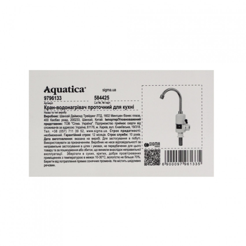 Про товар Кран-водонагрівач проточний s96 3.3кВт для кухні вилив вухо на гайці з індикатором і термостатом AQUATICA (9796133)