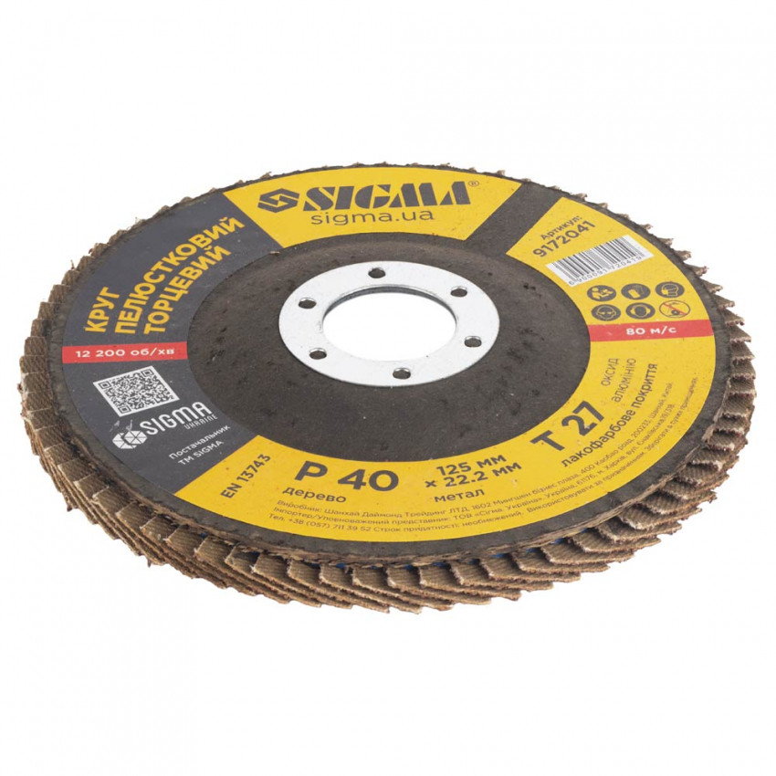 Круги пелюсткові торцеві Sigma 9172041 призначені для підготовчого та проміжного шліфування металу та зварних швів, зачищення деревини та зняття лакофарбових покриттів. Використовуються як робочий елемент кутової шліфувальної машини (УШМ). Електростатичний спосіб нанесення рівномірно розподіляє абразив по всій робочій поверхні пелюсткового кола; Кут нахилу пелюсток дозволяє покращити якість та швидкість обробки матеріалу; Мінімальний шум.