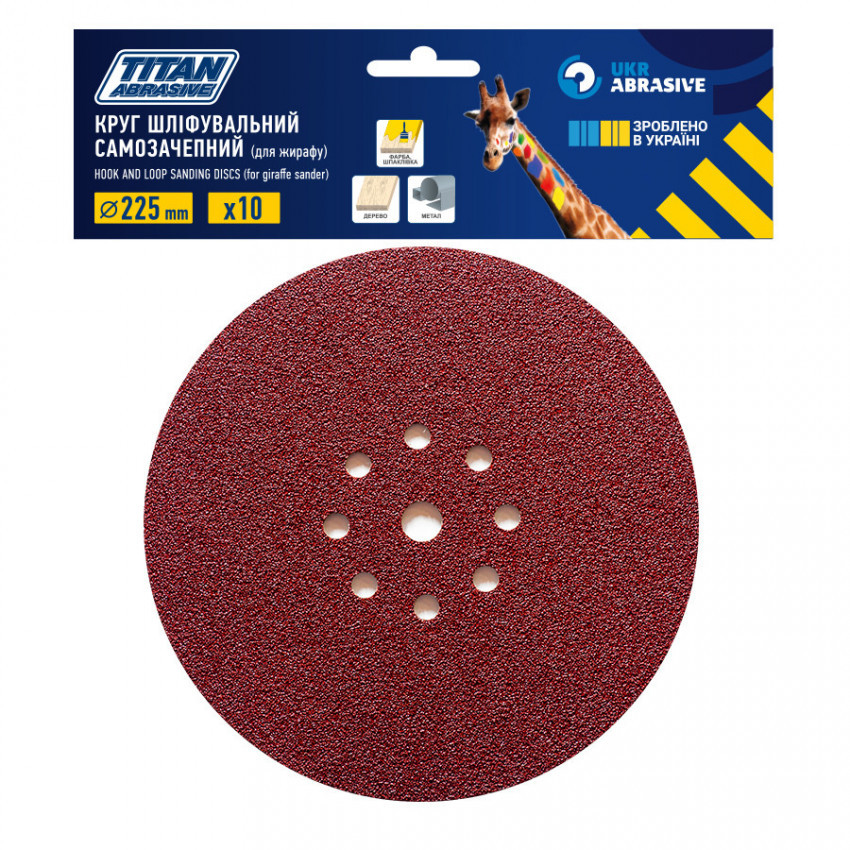 Самозачепні шліфувальні круги з отворами на липучці діаметром 225мм використовуються для шліфувальних машин типу "жираф" для обробки стін і стель.