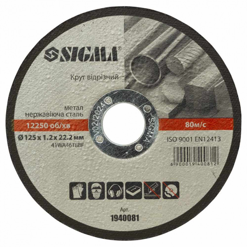 Круг відрізний по металу та нержавіючої сталі Ø125×1.2×22.2мм, 12250об/хв SIGMA (1940081) призначений для різання виробів з металів і нержавіючої сталі, роботи з кузовной сталлю і іншими аналогічними матеріалами. Робочим інструментом при роботі відрізного круга є кутова шліфувальна машина (КШМ, "болгарка").