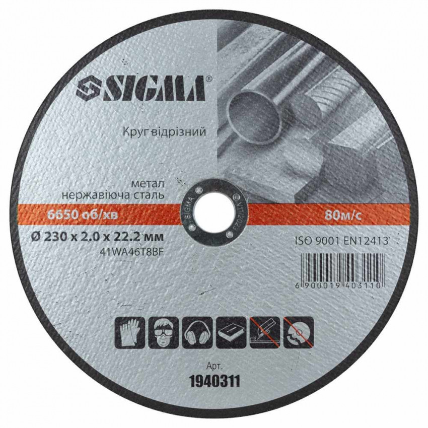 Круг відрізний по металу та нержавіючої сталі Ø230×2.0×22.2мм, 6650об/хв SIGMA (1940311) призначений для різання виробів з металів і нержавіючої сталі, роботи з кузовной сталлю і іншими аналогічними матеріалами. Робочим інструментом при роботі відрізного круга є кутова шліфувальна машина (КШМ, "болгарка").