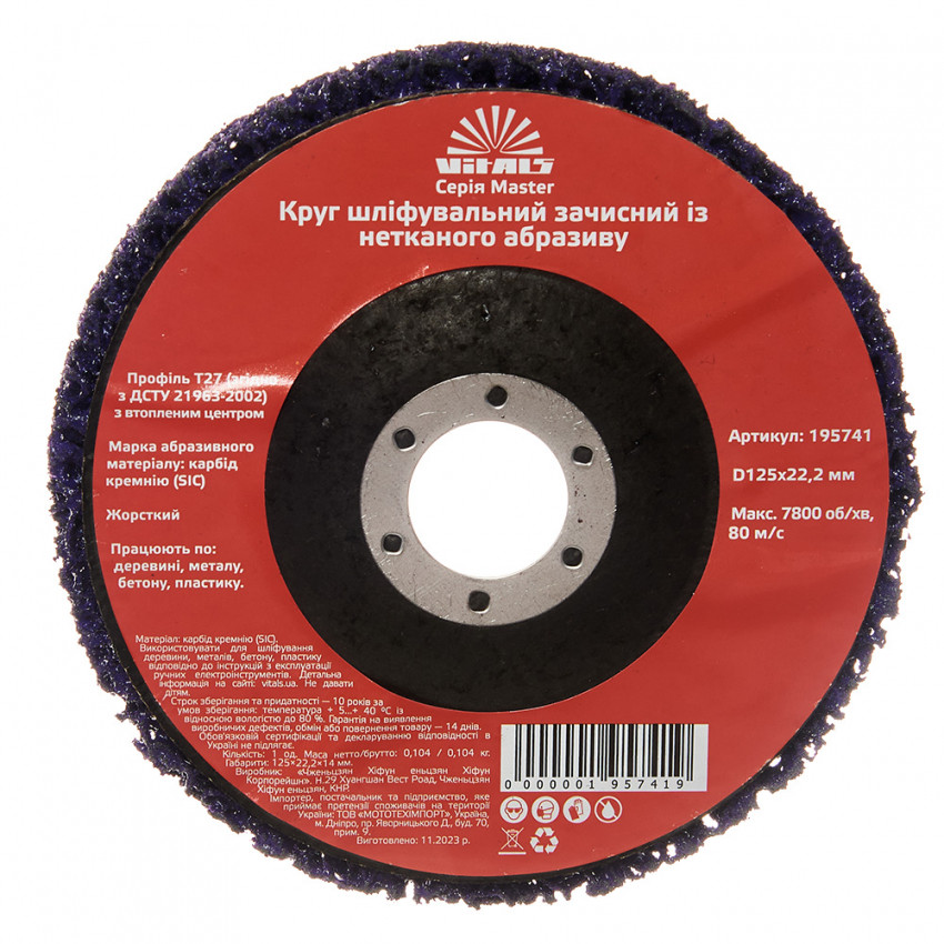 Круг зачисний з нетканого абразиву (корал) Vitals Master Т27 125×22,2 мм чорний м'який - це круг для зачищення і полірування різних поверхонь за допомогою КШМ. Круг призначений для видалення іржі, очищення зварювальних швів, видалення зварювальної окалини та застарілої фарби. Працює з різними матеріалами: нержавійною сталлю, чорними, кольоровими металами, скловолокном, бетоном, каменем, деревиною та пластиком. Має відкриту (пористу) структуру, що забезпечує високий ресурс роботи, запобігає перегріву металу. Круги мають кілька варіантів жорсткостей, відрізняючись кольором. Чорний круг – найм'якший та найделікатніший варіант. Ідеальний для видалення фарби із алюмінію, нержавійної сталі, кольорових металів.