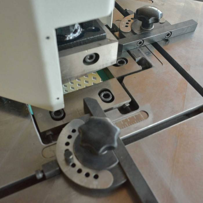 Для точної різки верхній стіл верстата забезпечений Т-образними пазами і оснащений системою автоматичного регулювання товщини щупа, яка не вимагає окремого регулювання для різання листів різної товщини.