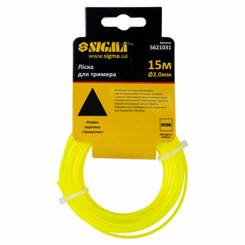 Ліска для тримера трикутник Ø2.0мм 15м Sigma (5621031) призначена для встановлення в котушки триммерів і служить для стрижки газонної трави та іншої рослинності. Виготовлена із високоякісного нейлону. По всій довжині має однакову товщину. Має високу гнучкість, міцність на розрив і зносостійкість. Чи не розшаровується і не втрачає своїх якостей. Товщина волосіні підбирається під параметри тримера.