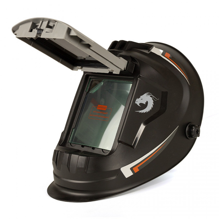 Зварювальна маска Welding Dragon WH-100 – маска зварника зі світлофільтром з постійним рівнем затемнення, який розташований на відкидному заборолі. Це дуже зручно під час роботи, коли необхідно перерватись від зварювальних робіт на підготовчі, оглядові або монтаж. Світофільтр просто піднімається уверх і не треба знімати маску при цьому.