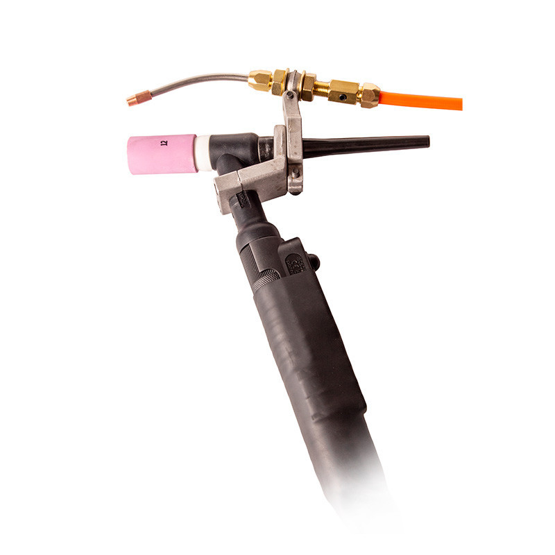 Для початку роботи пальник з джерелом підключають до механізму подавання дроту. Для цього на передній панелі відведено два роз’єми: один (нижній) для пальника, другий (верхній) – для джерела. Далі на пальник для аргонодугового зварювання кріпиться кронштейн. До нього підводиться канал для подавання дроту та напрямна втулка з встановленим на ній накінечником. Всі частини постачаються в комплекті механізму, тому підготувати пальник буде не складно.