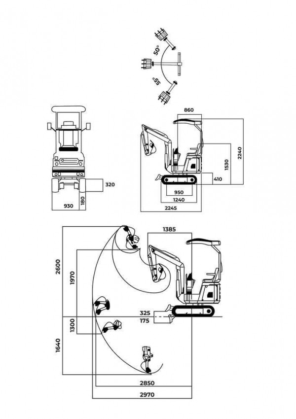 Завдяки широкому вибору додаткових аксесуарів, таких як шнек, гідромолот, змінні ковші, розпушувальний зуб і швидкозчіпний механізм, можливості використання екскаватора значно розширюються. Комфорт оператора забезпечує підвішене сидіння, а робоча ефективність підвищується завдяки повороту стріли на 55° вліво та 50° вправо.