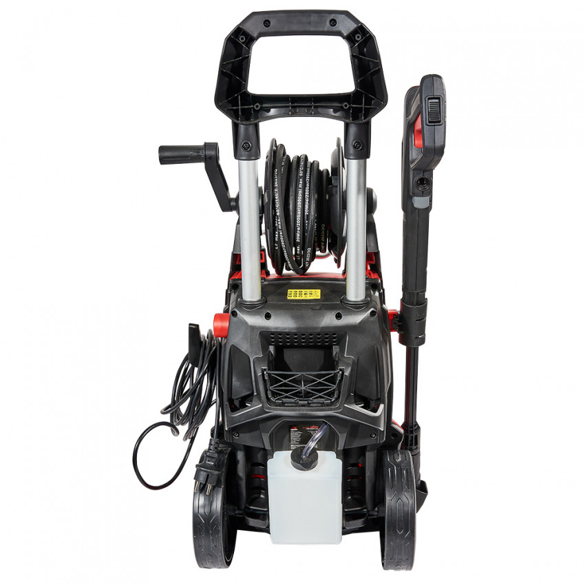 Приводний електродвигун і насос високого тиску об’єднані в блок. Робочий інструмент — пістолет з форсункою — під’єднаний до насоса довгим семиметровим шлангом високого тиску з металевим обплетенням. Щоб шланг не займав занадто багато місця, не заважав роботі й переміщенню, мийка оснащена спеціальною котушкою для намотування шлангу. Для зручності переміщення мийка оснащена колесами та телескопічною ручкою.