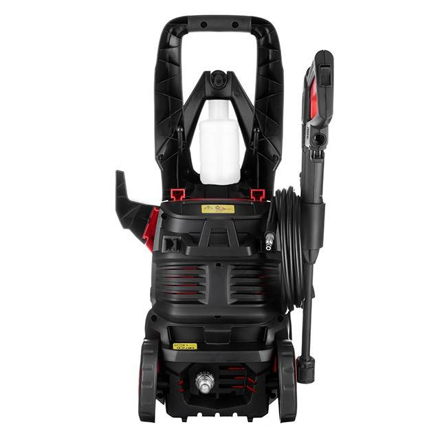 На корпусі з міцного пластику у спеціальному тримачі розміщуються: шланг (5 м), мережевий дріт (5м), насадка для піноутворення з бачком та пістолет високого тиску.