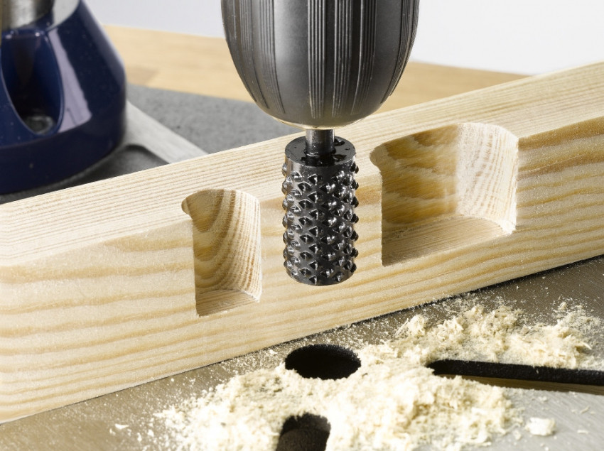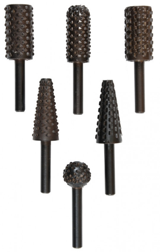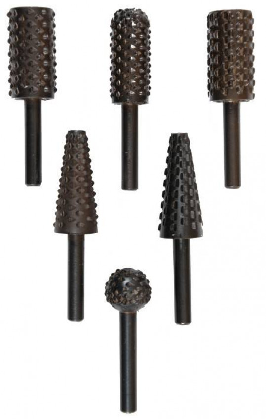 Диаметр хвостовика - 6 мм, Формы: цилиндрической формы, цилиндрическо-закруглённой формы, конической формы, коническо-цилиндрической формы, конической формы; 4 рашпиля для дерева, 2 рашпиля для цветного металла.