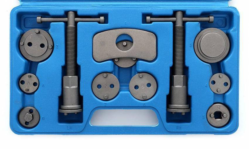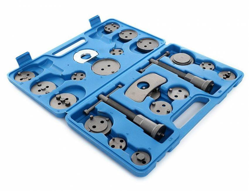 У комплект входять два преси (правий і лівий торсійні), дві балки для притиску преса до сідла затискача і широкий вибір перехідників. Точна підгонка перехідника і поршня є запорукою правильного введення поршня в циліндр гальмівного супорта. Це, в свою чергу, захищає механіку від заклинювання і заїдання поршня в циліндрі. Ручка оснащена магнітним наконечником, завдяки якому утримує на осі пластину, відповідну даному поршню. Набір рекомендований для загальномеханічних автосервісів, відмінно працює при роботі з керамічними поршнями.