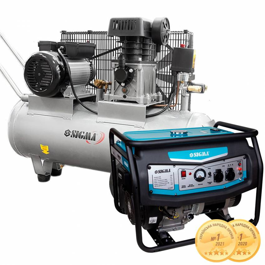 Про товар Набір генератор 5.0/5.5кВт 4-х тактний ручний запуск + Компресор двоциліндровий ремінний 2.5кВт 335л/хв 10бар 50л SIGMA (57104612)